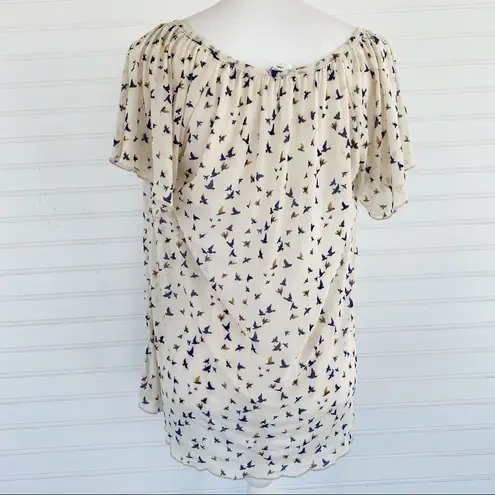 Cream colored blouse with blue and tan bird Print Cap sleeves, fringe tassel ties 100% polyester Size Small A bit of an oversized / Relaxed fit Measurements are included in pictures Smoke and pet free home Box C