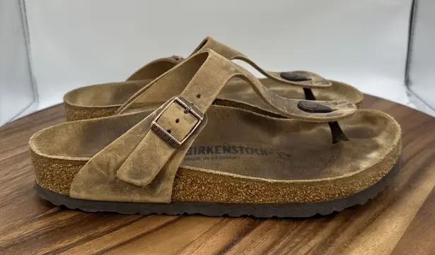 Oiled leather upper Slip on Between the toes Adjustable buckle Preowned. Some staining to the upper... Show more