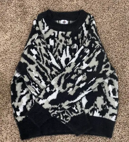 This sweater features a striking black and gray abstract pattern, perfect for adding a touch of styl... Show more