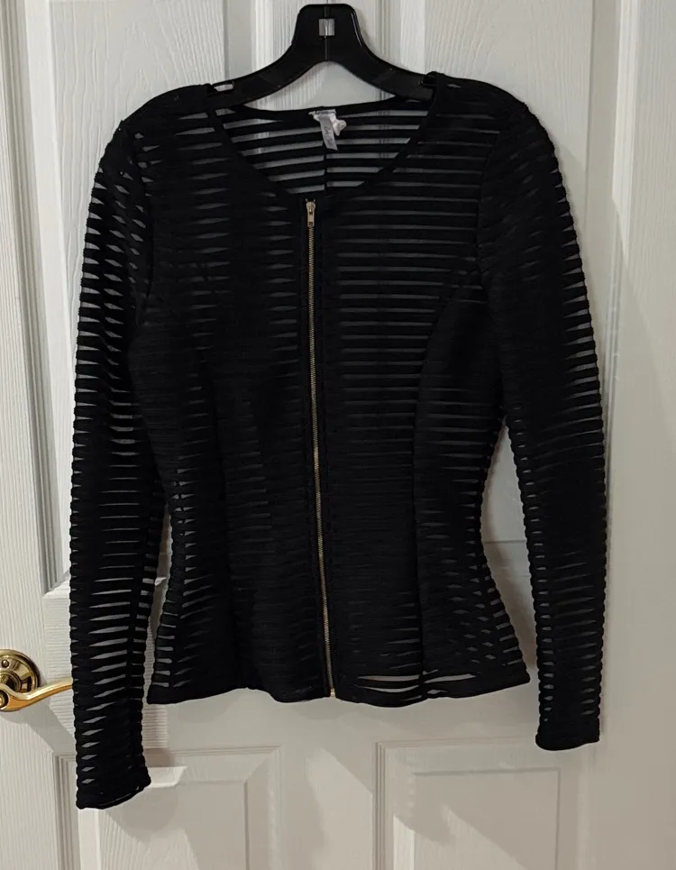 Elevate your style with this chic black sheer jacket. Perfect for layering and adding a touch of elegance to any outfit. Striped sheer with a fitted waist and slightly flared bottom. Brandon is San Julien. Size small. Some stretch the material. Gold zipper detail. Perfect condition. Smoke free home.