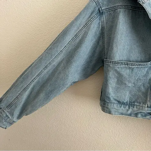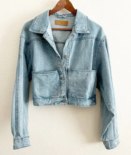 Blank NYC light was cropped denim jacket. Elastic detail on back hem. Front pockets. 100% cotton.... Show more
