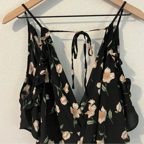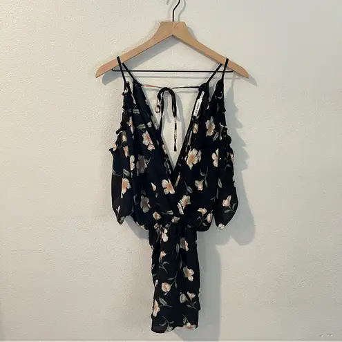 Blu Pepper Black Floral Chiffon Ruffle Trim Cold Shoulder V-Neck Romper Size L Floral print Elast... Show more