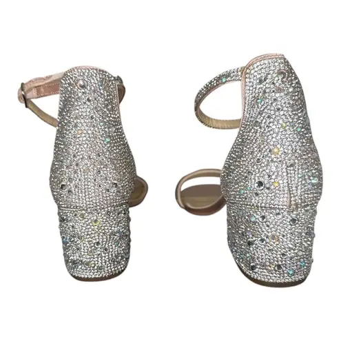 Something Blue by Betsey Johnson Women's SB-MARI Heeled Sand Womens size 7.5 heels .25 inch heel, low block heel sandal beautiful Multi sized silver rhinestone all over embellishments Round open toe design with adjustable ankle buckle closure good used condition! little ding on heel of one, please refer to pics!