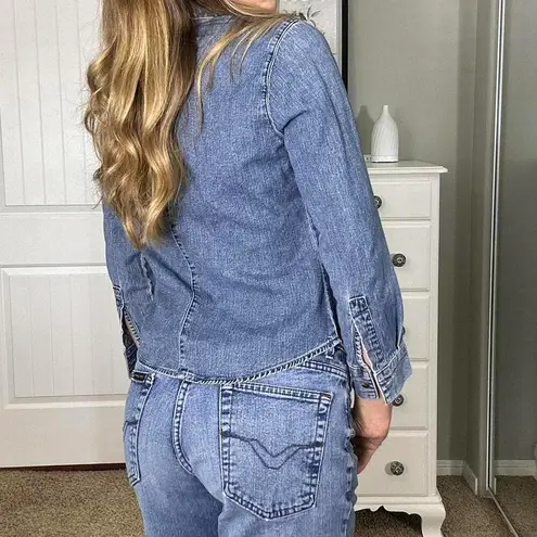Blue Koret denim button-up shirt with ruffled collar and lace details Size 6 - $25 - From Carly