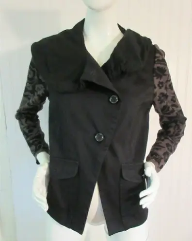 Blue Willi's jacket size small sweater knit back & sleeves button front black front brown & black print sweater knit back & sleeves good shape with normal wear Bust 18" across (36" around) Underarm to the bottom of sleeve 15" 22" long in back 23 1/2" long front