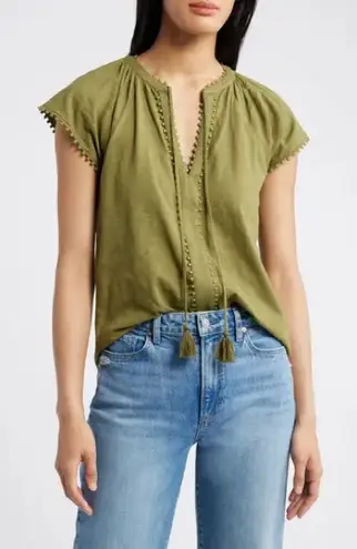 Pompom-inspired trim and tassel laces lend boho touches to a wardrobe-essential top cut from fresh cotton and framed by raglan sleeves. 24" length (size 8) Split neck with ties True to size