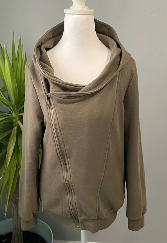 Elevate your casual wardrobe with this stylish and cozy asymmetrical zip-up hoodie from the POL brand. Known for its distinctive bohemian flair and comfortable, relaxed fits, POL infuses every piece with unique details that stand out from the crowd. This hoodie features a chic asymmetrical zipper and a flattering cowl neck design that adds a modern, fashion-forward twist to a classic hooded sweatshirt. The soft, medium-weight knit fabric offers both warmth and comfort, making it a perfect layering piece for any season. The color is a versatile olive neutral tone that pairs effortlessly with jeans, leggings, or your favorite casual bottoms. With its raw edge detailing and unique silhouette, this jacket is more than just a hoodie—it's a statement piece that embodies a free-spirited, boho-chic style. It's ideal for a cozy night in, a casual coffee run, or adding a stylish layer to your outfit for a day out. Features: Brand: POL Style: Asymmetrical Zip-Up Hoodie Color: Olive Material: Soft, comfortable knit fabric Details: Cowl neck, asymmetrical front zipper, relaxed fit Perfect for: Layering, casual outings, or a cozy, comfortable look.
