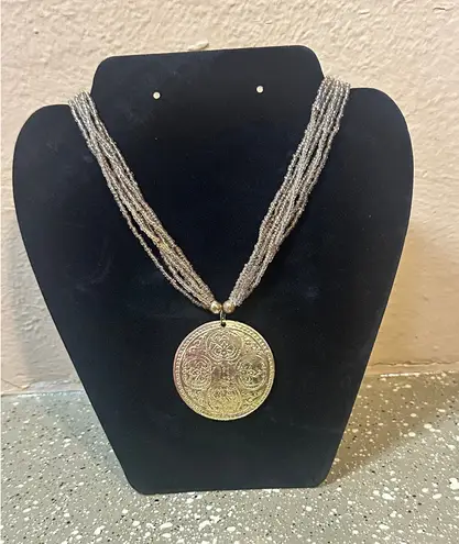 Style: Beaded, Pendant, Layered, Statement Type: Necklace Color: Gold Main Stone Color: Gold Pendant Shape: Round Metal: Gold Tone Secondary Stone: No Stone, Seed Bead Main Stone: No Stone Material: Metal, Seed Bead, Stone Base Metal: Brass Pendant/Locket Type: Coin Main Stone Shape: Round Country of Origin: India Keywords: Boho necklace, Gold medallion, Statement necklace, Seed bead necklace, Layered necklace, Womens necklace, Bohemian jewelry, Tribal necklace, Pendant necklace, Gold tone necklace, Costume jewelry, Fashion necklace No measurements will be provided!
