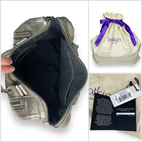 This Boston style Logan convertible satchel features the kind of stunning detail that sets a Botkier handbag apart. Crafted super soft, buttery pewter leather with a subtle silvery metallic finish, this versatile bag is finished with zip top closure, double handle, detachable crossbody strap, exterior zip pocket, decorative zipper details with leather tassel pulls and dark chrome hardware, plus lined interior with zip and cell pockets. Very pretty, edgy and high quality! Balenciaga vibes at a fraction of the price. Downsizing my bags, and this beauty has NEVER BEEN WORN. Marks to leather are as-purchased, and included is original dustbag, tags & certificate of authenticity. Approx dimensions: 12.5” wide 8” high 7.25” deep 7.5” handle drop 25” adjustable strap drop Modeled photo for reference only.