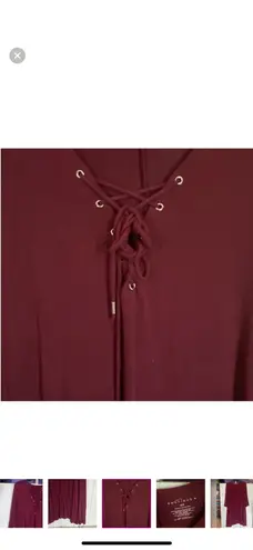 Boutique+ Dress. Size 0X. Burgundy. Long sleeves. Knee length. Lace, tie detail. Excellent condition. Keywords: fall, autumn, casual, knee length, long sleeves, stretch, Stylish burgundy dress with lace-up front. Perfect for any occasion.