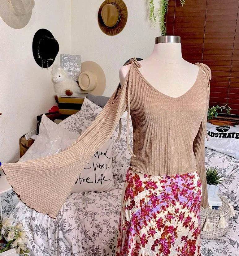 š Item: Knit Blouse š Brand: Boutique š Features: Cold Shoulders With Working Ties, Bell Sleeves, Rib Knit Stretchy Material, V Neckline, Lettuce Trim š Size: XS š Colour: Tan š Material: 100% Polyester š Occasion: Any, Very Versatile š Shipping: Free š Condition: New Without Tags š Measurements: - Length: 18ā - Bust: 36ā Relaxed - Waist: 30ā Relaxed