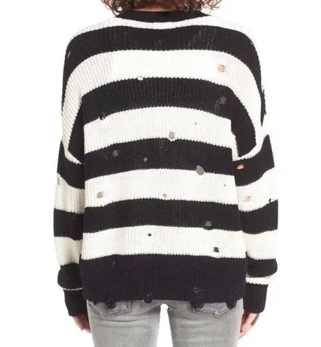 Black and white striped long sleeve sweater with intentional distressing. Drop shoulders. 100% cott... Show more