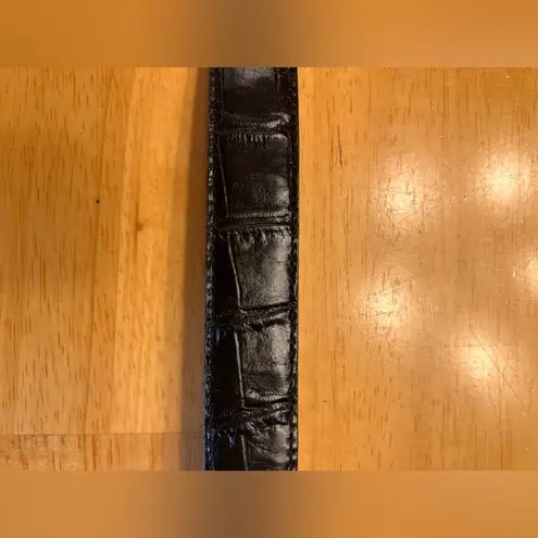 Chic black croc-embossed belt. Features a dual-tone gold and silver buckle. Perfect for stylish ense... Show more