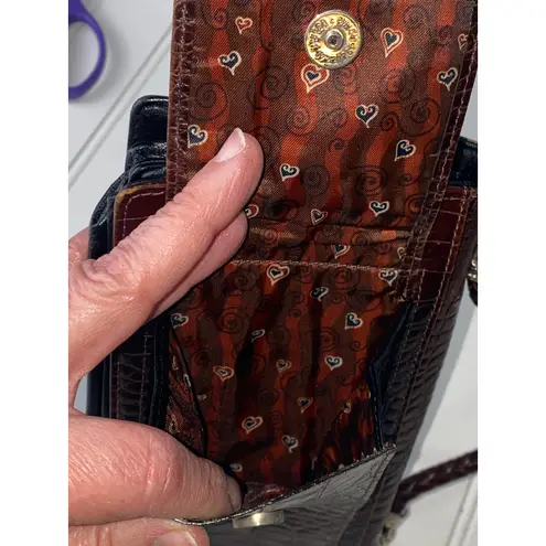 Rich dark-brown croc-embossed leather with Brighton's signature sculpted silver hardware. Compact to... Show more