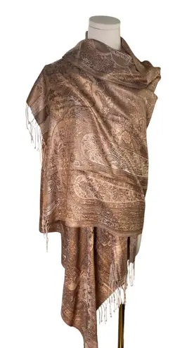 Elegant bronze-taupe pashmina-style wrap with a subtle paisley jacquard pattern and twisted fringe e... Show more
