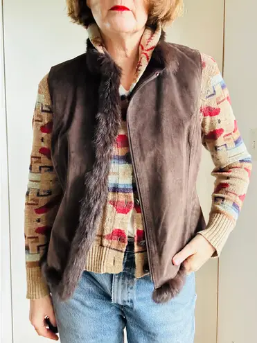 Y2K brown suede vest with cozy faux fur trim — the ultimate fall layering piece. Soft, plush, and effortlessly cool, this size 12/L vest channels early 2000s heritage style with a modern boho twist. Pair it with jeans, a turtleneck, and boots for that perfect cozy-core autumn vibe. Details: Full Zip Rabbit Fur Trim Lined Pre-owned Measures Flat Bust 20" Length 24" #Y2KStyle #VintageVest #BrownSuede #FauxFurTrim #FallFashion #HeritageStyle #CozyCore #BohoVintage #Y2KVintage #LayeringSeason #RetroVibes #VintageFinds #LadyBirdieVintage hgh 1 p OT25 1234
