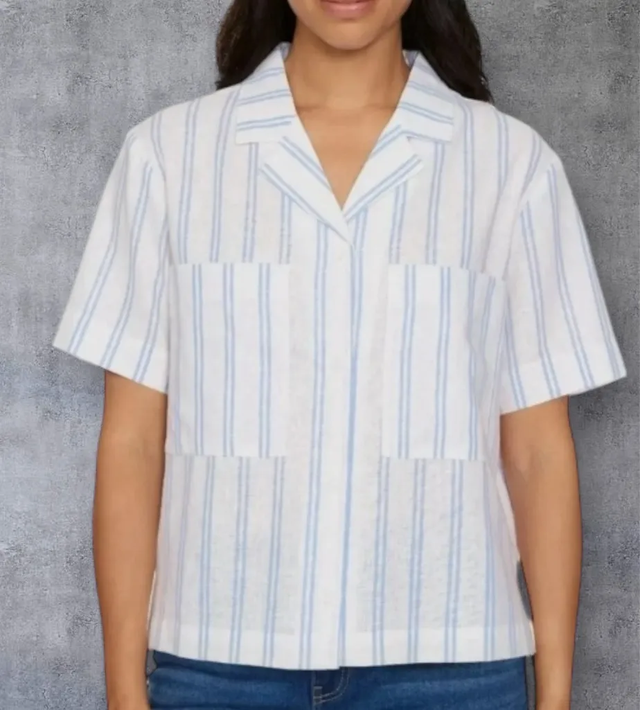 Colors: Blue and White (Coastal Stripe) Front button closure Notched collar Short sleeve Relaxed fit Blended with Natural Linen Fibers Two Chest Pockets Content: 55% Linen | 45% Viscose Midweight Size: Medium Sizing Reference: Sizes: XS - 3X Size Conversion: XS = 2 | S = 4-6 | M = 8-10 | L = 12-14 | XL = 16 | XXL = 18 | 2X = 20 | 3X = 22