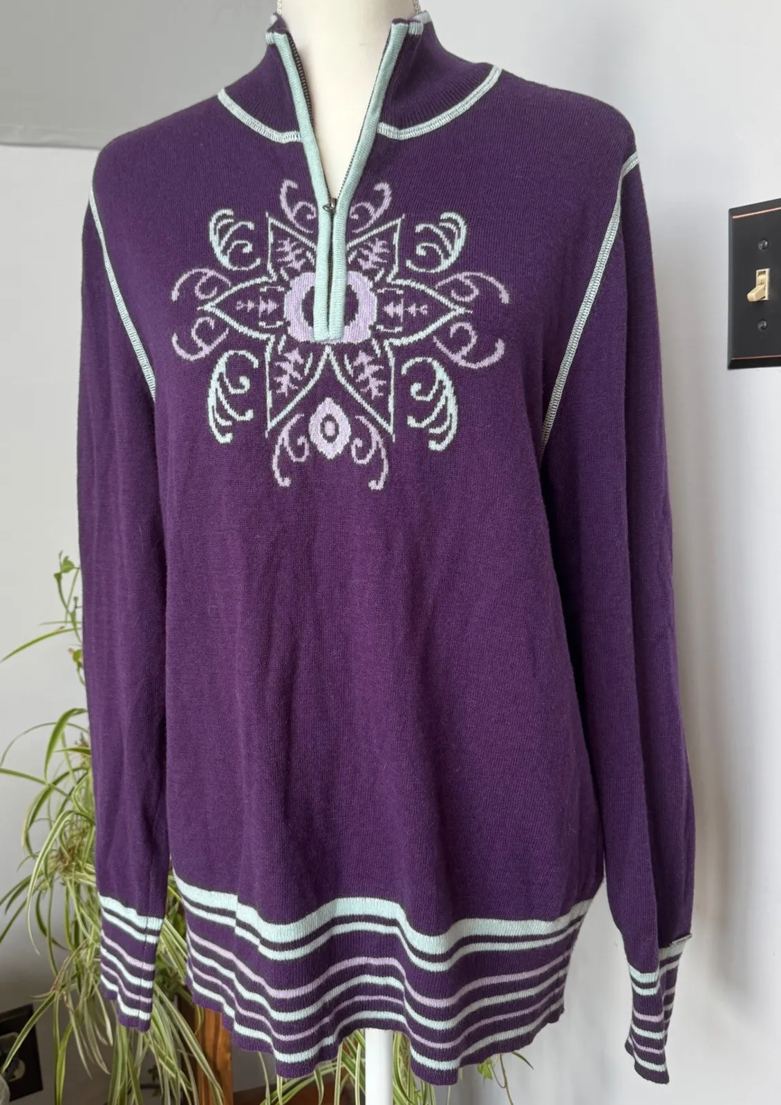 Elegant quarter-zip sweater by Cabelas, made for stylish warmth. This purple pullover features a unique snowflake-inspired design on the front, complemented by light green accents on the collar, zipper, cuffs, and hem. The subtle detailing along the seams adds a touch of sophistication to the overall design. This sweater offers both comfort and style, making it a versatile piece for cooler weather. Perfect for casual outings, weekend getaways, or cozy evenings by the fireplace. Measurements: • Length: 27 inches • Chest: 21 inches Style: Pullover Color: Purple Department: Women Type: Sweater Material: Wool, Wool Blend, Nylon Keywords: Cabelas, Womens sweater, Purple sweater, Quarter zip sweater, Wool blend sweater, Pullover top, Large sweater, Long sleeve sweater, Winter sweater, Casual sweater, Outdoor apparel, Ski sweater, Snowflake desigN