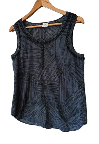 Pre-owned Cabi sleeveless top, size small, shows a blue and black abstract print on a textured fabri... Show more