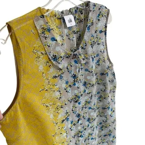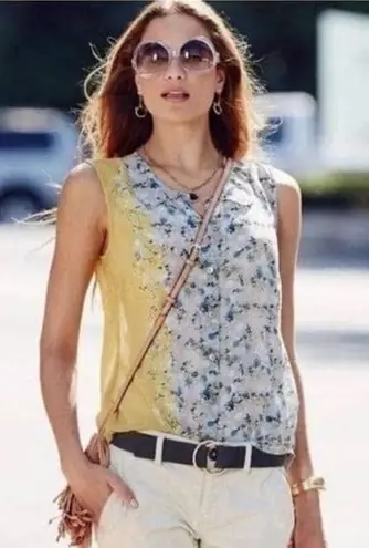 This sleeveless floral button-down blouse features a mixed print with yellow and floral panels, offe... Show more