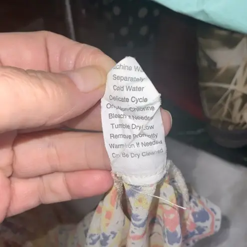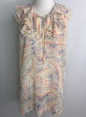 Like New CAbi pastel watercolor sleeveless blouse with a ruffled neckline Key hole with tie on fron... Show more