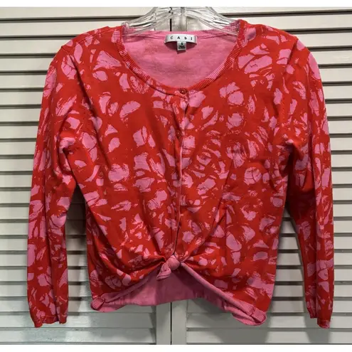 The CAbi Red/Pink Abstract Crop Long Sleeve Sweater Button Up in size Small with a Crew Neck is a ve... Show more