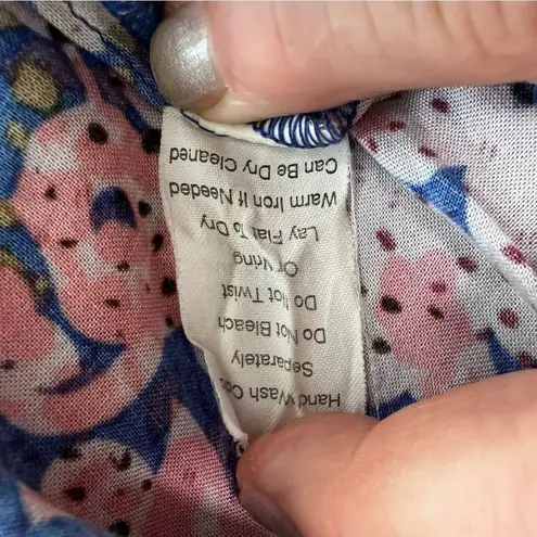 Cabi women's tunic top in a vibrant blue floral print with a gradient of coral and blush tones. Feat... Show more