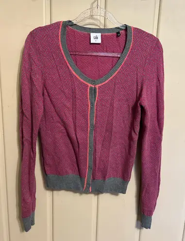 Chic CAbi cardigan with a vibrant pink and gray pattern. Perfect for layering. The Cabi Cardigan Swe... Show more