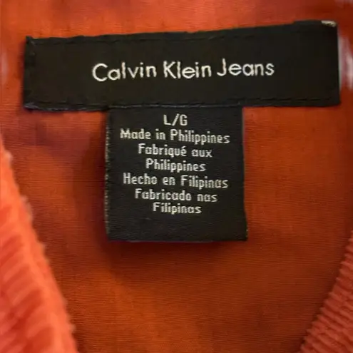 Color is like a burnt orange with gold buttons and graphic on the back. Small stain on one sleeve s... Show more