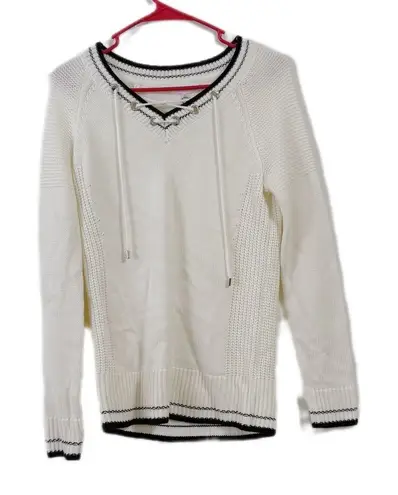 This Calvin Klein sweater showcases a sophisticated V-neck design in a classic white and black color... Show more