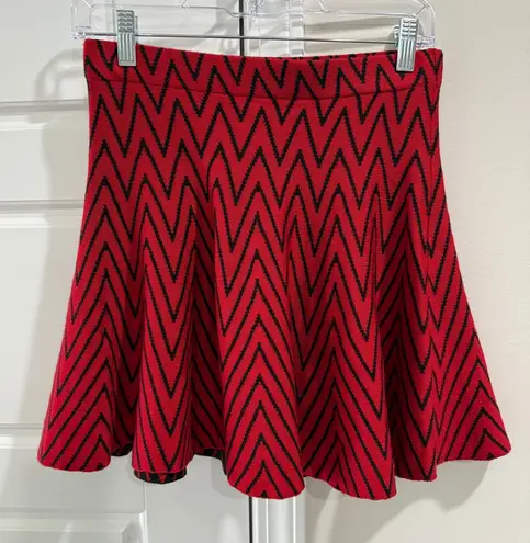 Vibrant red and black skater skirt with bold chevron zigzag pattern. 90s style. Excellent preowned i... Show more