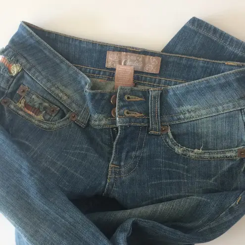 Scruffed up and patched Candie’s jeans. Size 0. Inseam measures approximately 25” when they are uncu... Show more
