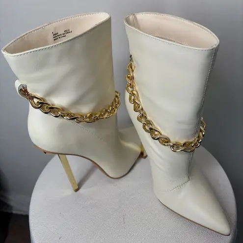 Step out in style with these Cape Robbin Joelle ankle boots in an elegant white/ivory tone. Designed with a sleek pointed toe, high stiletto heel, and a bold gold chain ankle detail, these boots add a chic and modern statement to any outfit. ✨ Details: • Brand: Cape Robbin • Model: Joelle • Women’s Size 6 US • Color: White / Ivory • Pointed toe ankle boots • High heel design • Decorative gold chain accent • Man-made materials • Made in China 👠 Condition: Lightly used, excellent condition. Minor superficial mark on the toe (shown in photos). Soles and heels remain in great shape with very little wear. Perfect for evening wear, special occasions, or elevating everyday outfits with a fashion-forward touch.