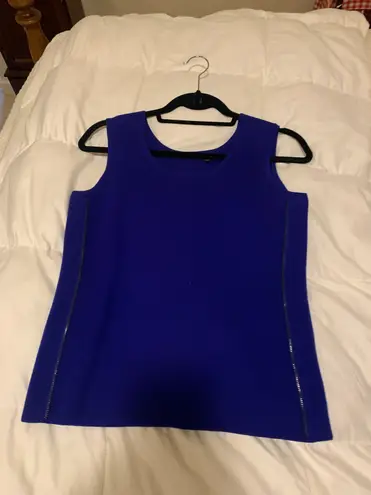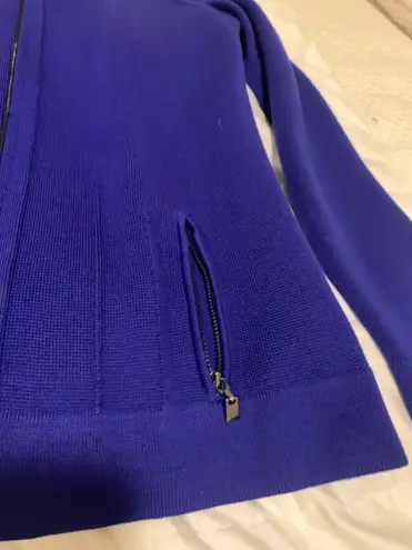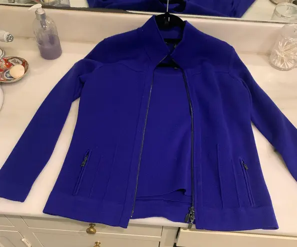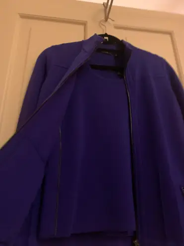 Great condition, Pretty Blue color, Material is stretchy with pockets on the jacket, also has adorable zipper like appearance on sleeveless top. Set has small stain on jacket close to right side zipper that is mostly invisible!