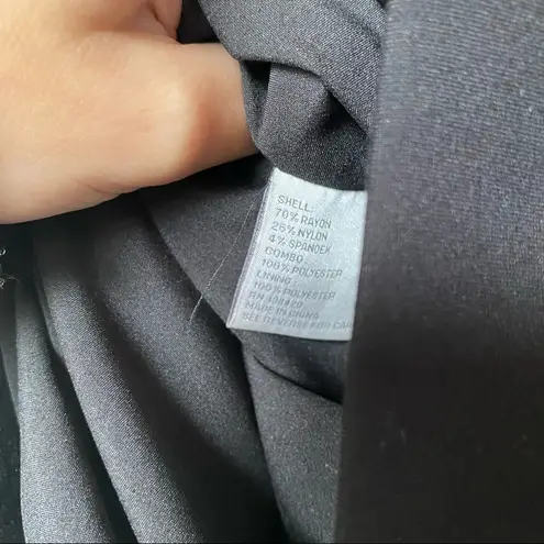 Black shift dress with cropped sleeves and lace cuffs. Cutouts on either side of the chest. Lined. Some discoloration on the lining. Small mark on the front left and on the back of right arm. Material: 70% rayon 26% nylon 4% spandex Condition: Pre-Owned