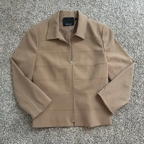 Good condition other than than marks shown in last two pics Brand - Carlisle Size - 12 Material - polyester, polyurethane - tan color - zip up front - long sleeves - fully lined - stripes stitch detail - casual, business casual Approximate lay flat measurements: - length - 24 in - pit-to-pit - 18 in Please see pictures for detailed measurements I consider reasonable offers! Check out my closet for additional bundle discounts