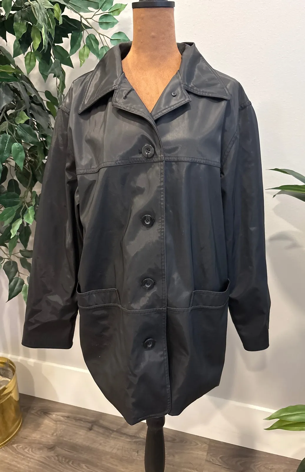 Elevate your outerwear with this chic Carte trench coat. Crafted for a sophisticated silhouette, this jacket offers a smooth, sleek finish that effortlessly complements any ensemble. The classic button-front closure and convenient front pockets add both style and practicality, making it a go-to piece for transitional weather. Perfect for a polished look on your daily commute or a refined addition to your weekend ensemble. Minor peeling on back collar shown in photos price reflects Measurements: • Pit to Pit: 23 in • Length: 30 in • Sleeve Length: 23 in Gcoat Type: Jacket Outer Shell Material: Polyurethane Style: Rain Coat Department: Women Lining Material: Polyester Accents: Button Features: Collared, Lined, Single-Breasted Pattern: Solid Insulation Material: Polyester Season: Spring, Fall Closure: Button, Snap Occasion: Casual, Travel Sleeve Length: Long Sleeve Keywords: Carte jacket, womens trench, lightweight coat, button front, black outerwear, classic style, transitional jacket, everyday wear, workwear, casual chic, smart casual, minimaliste