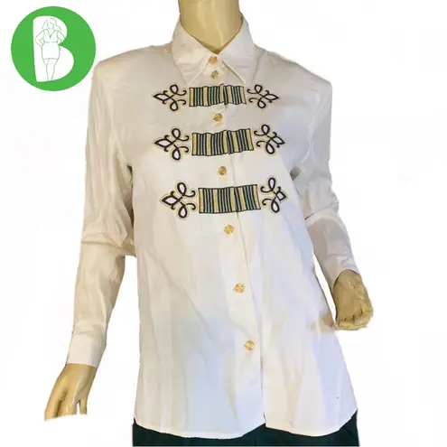 This listing is priced for the top pictured only. Casual Corner -white, green, blue & gold -embroidered -button down -gold tone buttons -cotton -unlined -shoulder pads -vintage circa 1990's Top is marked size 6 (38 inch bust) -please use measurements provided in photos for fit determination; Size tags alone, are not a reliable source. Item is free of holes. There is a spot on the back part of the collar. Preowned items (especially vintage pieces) are subject to any minor imperfections which come with an article of clothing that has been washed and worn; these signs of wear generally include light pilling or fuzzing, loose threading or wrinkling. Some listings may not include these issues, but as a general disclaimer, please be aware it is possible. Unless indicated, there is no major damage to a piece. To mitigate the cost of the items and avoid any issues customers may have with allergies, we leave desired cleaning to the new owners.