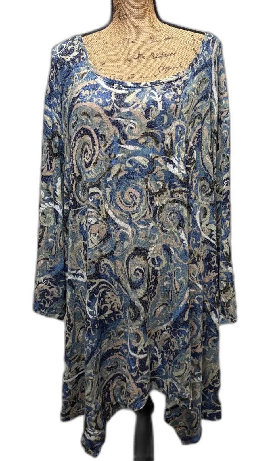 Catherines Blue Abstract Paisley Tunic Tee Flowy Bohemian Plus Size 5X Gently used condition with no visible flaws! Features: - Two tone blue and cream siwrly paisley print - Scoop neck - Long sleeves - Asymmetric hem - Tunic length - Rayon, polyester, spandex blend - Plus size 5X casual, boho chic, bohemian, flowy, modest Measurements: All measurements taken laying flat! Bust: 33 inches Length: 33 inches Thank you so much for shopping with me, and please let me know if you have any questions! Offers are always welcome. Bundle to save.