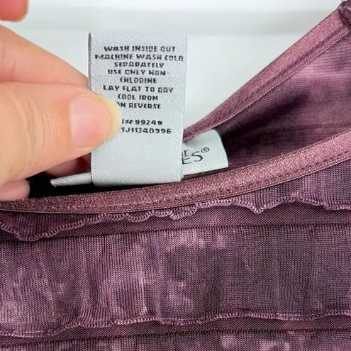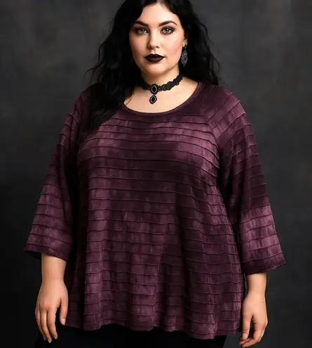 Catherines Maggie Barnes Tiered Ruffle Tunic Top Whimsigoth Lagenlook Boho Tiered pleated ruffles on entire shirt Light chiffon like material with lining behind layer Round neck, flowy 3/4 sleeves ALl over Tie-Dye like purple print **The model photo is computer generated. Please look at all photos for accurate details** Good Pre-owned condition, please see photos SIze 4X 30/32 95% Polyester 5% Spandex Approximate measurements in inches: Pit to pit: 33.5 Shoulder to hem: 16 Sleeve length (from underarm): 32 whimsigoth, lagenlook, boho, romantic boho, soft goth, art teacher style, indie bohemian, cottagecore adjacent, textured top, tiered ruffle top, crinkle fabric, burnout look, sheer texture, plum purple top, eggplant, long sleeve tunic, flowy top, oversized fit, plus size top, size 4X, 30/32, stretchy knit, lightweight layering, fall layering piece, statement texture top, tie dye, chiffon