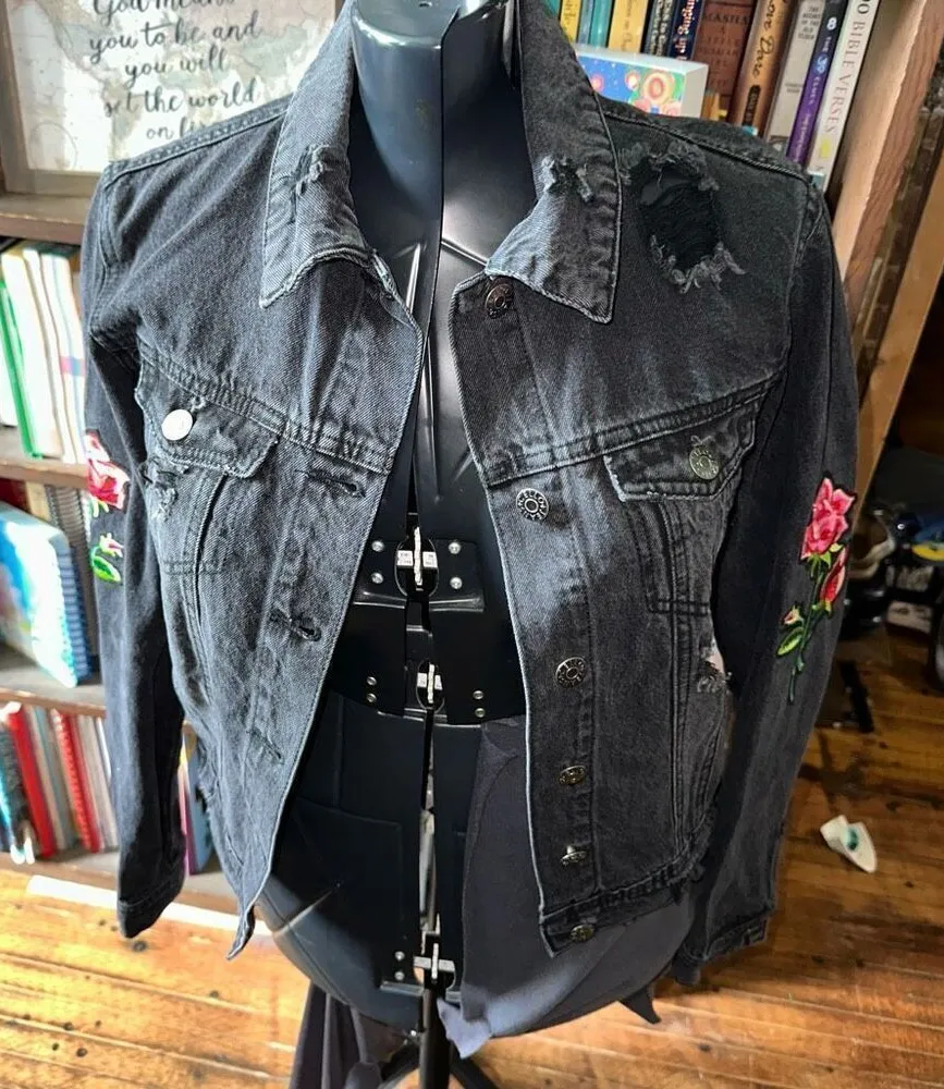 Cello destroyed, rose embroidered, black, Bikercore, denim jacket. Great, classic jacket. Approximat... Show more
