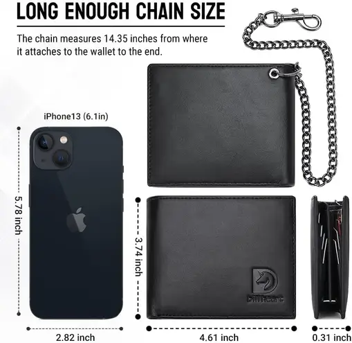 NEVER LOSE YOUR WALLET:Still bothered about losing your wallet often!? It's easy to lose your wallet during a ride/outdoor activity/work, isn't it!? So We added a chain to connect the belt loop to the wallet.With a chain wallet, you never have to worry about losing the important items in your wallet. FILL IT AS YOU WISH! With a total of 12 card slots, you can put all your important cards in the slots. Put your ID card in the slot where you can easily see it, cash in the bill department, and change or checks in the pocket with the zipper. LEATHER MENS RFID WALLET:You don't have to sacrifice the good looks of a chain wallet for security. We've included RFID blocking protection for wallets in our chain wallets so you can safely use it as a credit card holder, travel wallet, front pocket wallet or secure ID card wallet. NICE UNBOXING, TOO:No other chain wallet will come in such a nice gift box! It's as special as the men's wallet it holds.