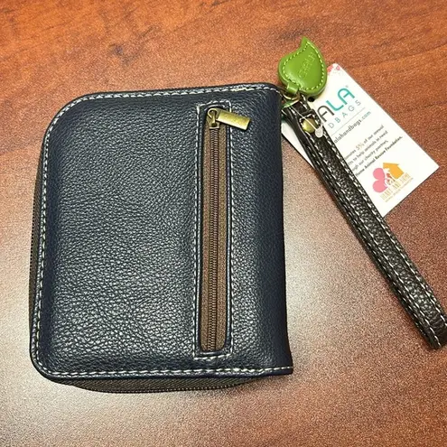 Chala Vegan Leather Cardinal Zip Around Wallet Clutch. Back zipper pocket for change. One clear slot for ID. Decorative leaf shaped zipper pull charm. Wrist strap. Brand new with tags. Color- Navy 5.5” H x 4.5” W x 1” D From a smoke and cat free home. All proceeds from the purchase of this item benefit a homeless shelter for pregnant women and their children in St. Louis, MO.