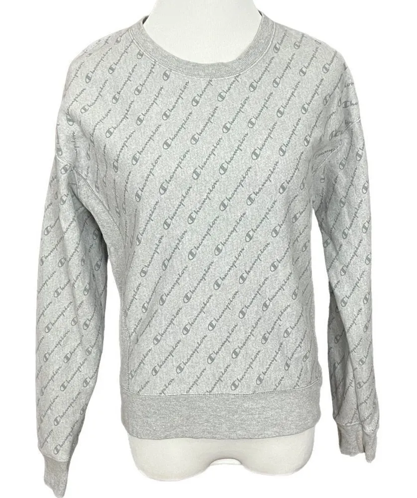 Gray crewneck sweatshirt from Champion Reverse weave Darker Gray allover logo print Embroidered pat... Show more