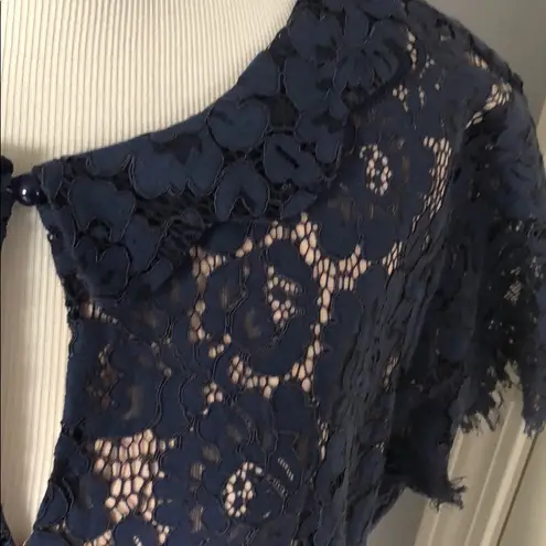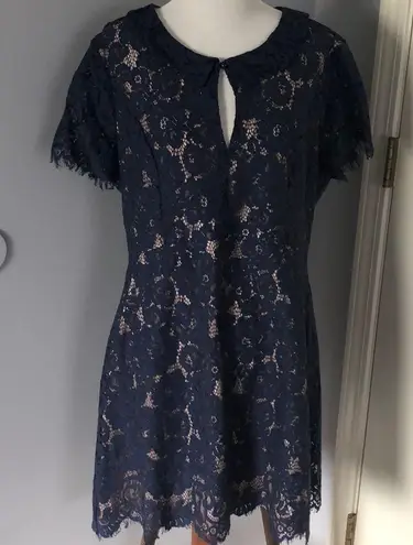 Size XL but fits more like a large. Beautiful quality lace navy dress with tan liner underneath for... Show more