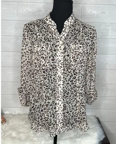 Chico's animal print semi-sheer button front blouse. banded collar, flap button chest pockets.3/4 sl... Show more