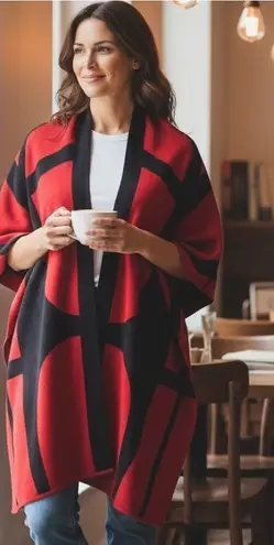 Elevate your wardrobe with this stunning Chico's cape shawl poncho! Featuring a bold red and black... Show more