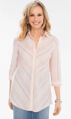 Chico’s No Iron Linen Stripe Loop Back Blouse 0/XS. Vanity size 0 equivalent to US XS/4. Great condi... Show more