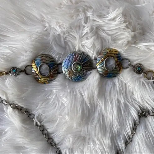 Chico’s chain belt ~ abstract ocean vibes Sand dollar shaped ~ center multi colored stone ~ lobster... Show more