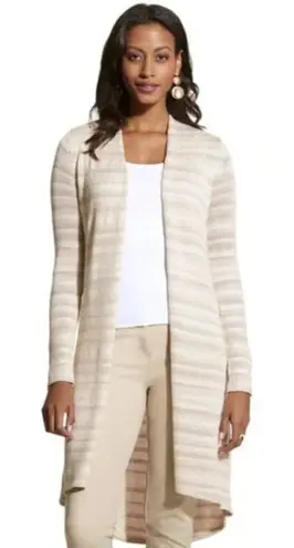 - great for layering. Open front, no closures. Long sleeves, neutral, coastal, etc. Tags - casual classic comfortable relaxed fall winter warm knit cozy comfy loungewear everyday closet long neutral cardigan sweater academia back to school. Retails for $119.00. Color: Cream + Taupe (Stripes), ▪ Open Front Design, Long Sleeves. Note - stock photo is not the exact sweater being sold, but shows similar fit and style. Tags - boho, cottage, coastal grandma, resortwear, floral, girly style, preppy fashion, hippie, western vibe, granola girl aesthetic, prairiecore, lagenlook, crunchy mom, sustainable, academic, fall, distressed, layered look, vintage-inspired, Y2K fashion, bohemian style, outdoor activities, nature-inspired, minimalist, unassuming.
